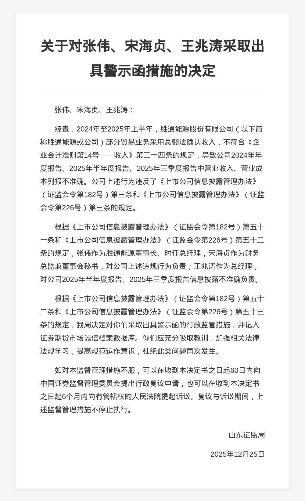 决定书显示,胜通能源股份有限公司2024年至2025年上半年,公司部分贸易业务采用总额法确认收入,不符合《企业会计准则》的规定,导致公司2024年年度报告、2025年半年度报告、2025年三季度报告中营业收入、营业成本列报不准确。