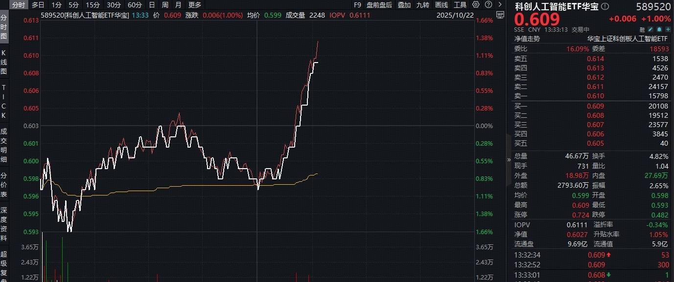 今日(10月22日)午后配资论坛线上,重点布局国产AI产业链的科创人工智能ETF(589520)快速翻红,直线拉升,场内价格现涨1%,冲击日线2连阳。成份股方面,寒武纪领涨超5%,芯原股份涨逾3%,复旦微电、奥比中光、石头科技等个股跟涨。
